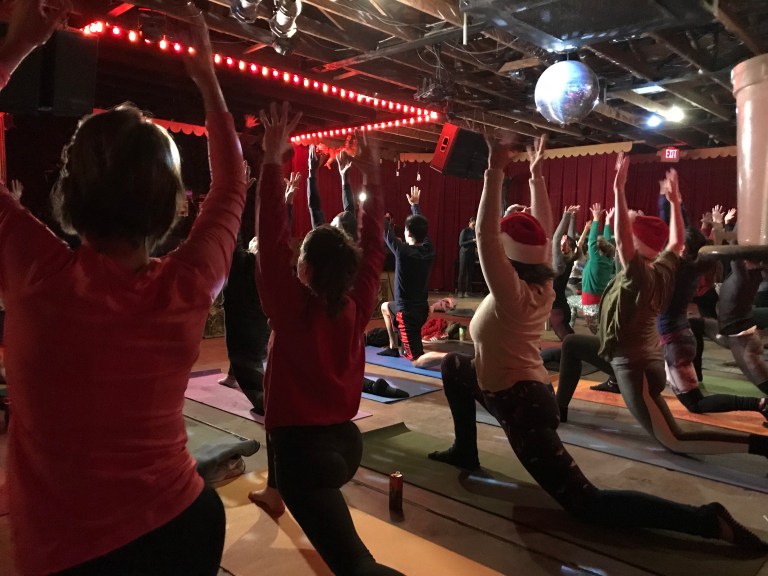 We stretched, twisted and mediated – with our socks on because it was super cold – under the sparkling disco ball to get our bodies moving and blood flowing. Then DJ Chorizo Funk and hip hop husband and wife duo
