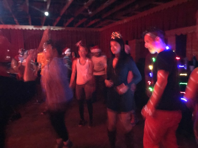 The music was pumping like a night club and all around was a sea of Santa hats, sparkly wigs and tinsel clad dancers jumping up and down and working up a sweat to the stylish sounds of the African drummer and live Saxophonist throwin it down. Some brave people even got to show their moves on stage with Riders Against the Storm, and they brought their A game to dance floor by twerking, twirling and titillating the crowd!