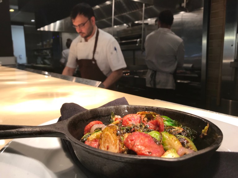 The first course was a delicate asian-inspired plate of fresh diver scallops accented with avocado, sesame seeds, sesame oil, ginger, soy and Banyuls vinegar. The surprise twist to the dish were the small cubes of pickled cantaloupe sprinkled with chile flakes and oregano that makes for a sublimely sweet and tangy finish. As the aperitif started to kick in, the second course made its way to the table in the form of crispy charred brussel sprouts mixed with farm-fresh Andouille sausage.