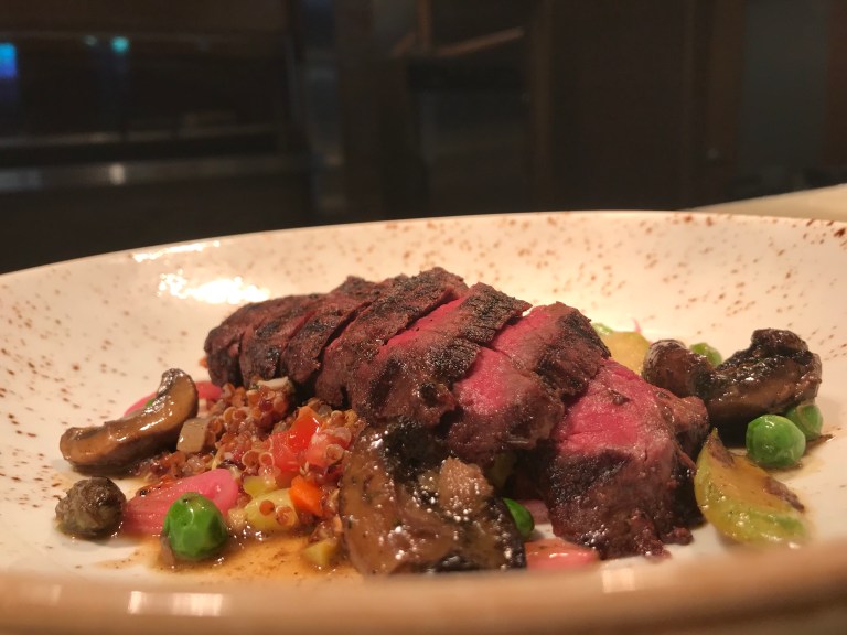 Served in a piping hot mini skillet, this sweet and savory appetizer is flavored with local honey, shallots and banyuls vinegar. While the andouille sausage adds a sublimely sweet and spicy after-taste, the flaky charred edges and soft warm hearts of the otherwise underrated brussel sprout are the star of this dish! Then it was onto the main course: a melt-in-your-mouth local hangar steak served on a bed of tangy quinoa.