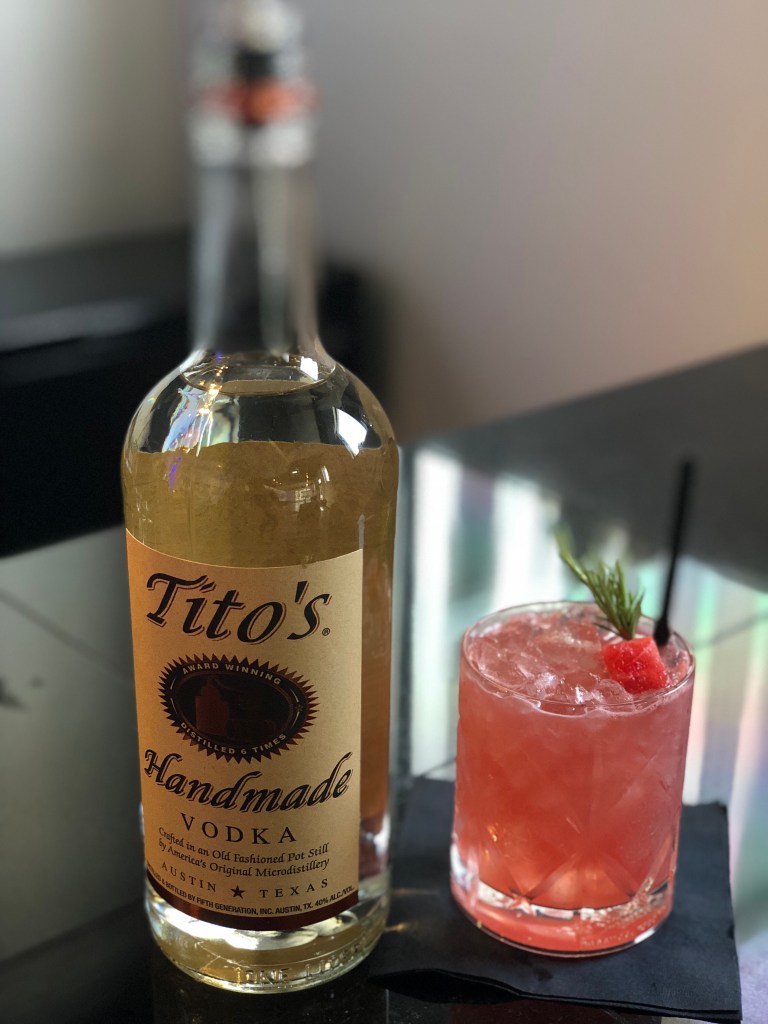This vodka-based cocktail is fruity and refreshing, with hints of melon and rosemary. To make, add 1.5 oz Tito’s vodka, 1 oz rosemary infused simple syrup and 4 cubes of fresh watermelon in tall glass. Muddle for about 5-10 seconds or until all the fruit is blended. Add ice, cover with a shaker and shake vigorously. Then strain the mixture into a glass with ice and top with sprite or soda water. To garnish, add a cube of lemon and a rosemary sprig.